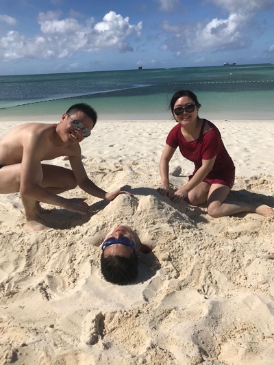 海邊細細白白軟軟的沙子,溫柔地包圍著你的腳,誰都想踩在上面。可能不只是踩,躺著也是舒服極了,這不,就有人呈大鵬展翅狀被埋在沙子中了。三三兩兩的人,不停地往他身上填沙子,也甚是好玩。林領導還特意惡搞,堆出了他缺少的身體零件~~