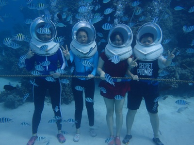 雖然潛水再次以失敗告終,但至少戴著能讓你在水中自由呼吸的“頭盔”,還是下到了并不算深的海底,魚兒密密麻麻蜂擁而至的時候,到底還是開心的,嘴巴沒有合攏過,喂食、合影,好不歡樂!