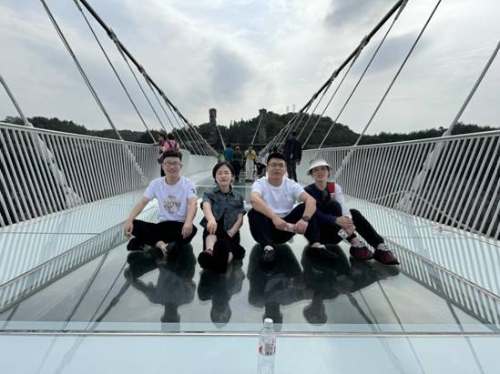 對(duì)于我而言,走上玻璃橋是對(duì)自身勇氣的一次大考。起初的緊張、恐懼,隨著一步步向前,逐漸轉(zhuǎn)變?yōu)槌删透泻妥孕拧S绕涫窃诳朔俗畛醯目謶郑赂业卦跇蛏闲凶摺⑴恼眨踔恋皖^望向腳下的深淵,那種戰(zhàn)勝自我的喜悅難以言表。