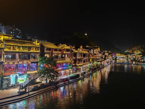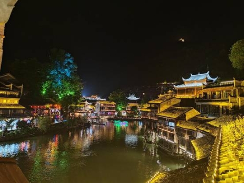 當(dāng)夕陽(yáng)西下,夜幕緩緩降臨,鳳凰古城便披上了一層神秘而迷人的面紗,展現(xiàn)出與白日截然不同的風(fēng)情。此時(shí)的古城,不再是靜謐與古樸的代名詞,而是化身為一個(gè)燈火輝煌、熱鬧非凡的夢(mèng)幻世界。
