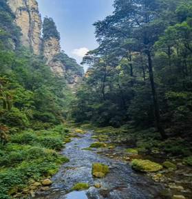 金鞭溪,一條蜿蜒在山谷中的清澈溪流。沿著溪邊的木棧道緩緩前行,耳邊是潺潺水聲和偶爾傳來的鳥鳴,空氣中彌漫著泥土與植被的清新氣息。兩岸,奇峰聳立,形態各異,有的如劍指蒼穹,有的似老翁沉思,大自然的鬼斧神工讓我目不暇接。