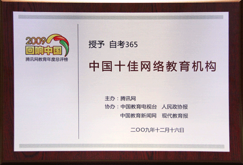“2009回響中國”騰訊網教育年度總評榜頒獎典禮于2009年12月16日在北京香格里拉飯店舉行。正保遠程教育旗下品牌網站自考365榮獲“中國十佳網絡教育機構”稱號,與自考365同獲此殊榮的還有正保遠程教育強勢品牌正保會計網校、財考網等。