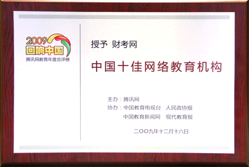 “2009回響中國騰訊網教育年度總評榜”頒獎典禮于2009年12月16日在北京香格里拉飯店舉行。正保遠程教育旗下品牌網站財考網榮獲“中國十佳網絡教育機構”稱號,與財考網同獲此殊榮的還有正保遠程教育強勢品牌正保會計網校、自考365等。