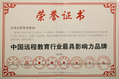 2009年1月11日,第五屆(2008)“中國品牌影響力高峰論壇”年會在北京人民大會堂隆重召開。正保教育榮獲“中國遠程教育行業最具影響力品牌”,董事長、總裁兼CEO朱正東當選“改革開放30年中國教育行業十大杰出企業家”。